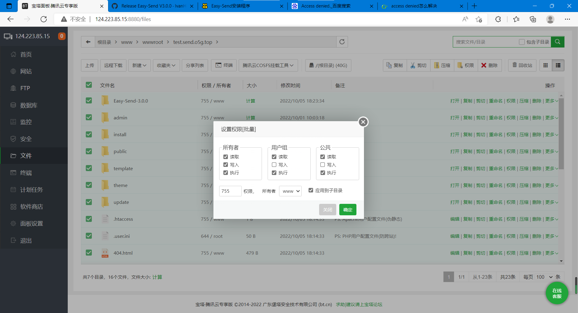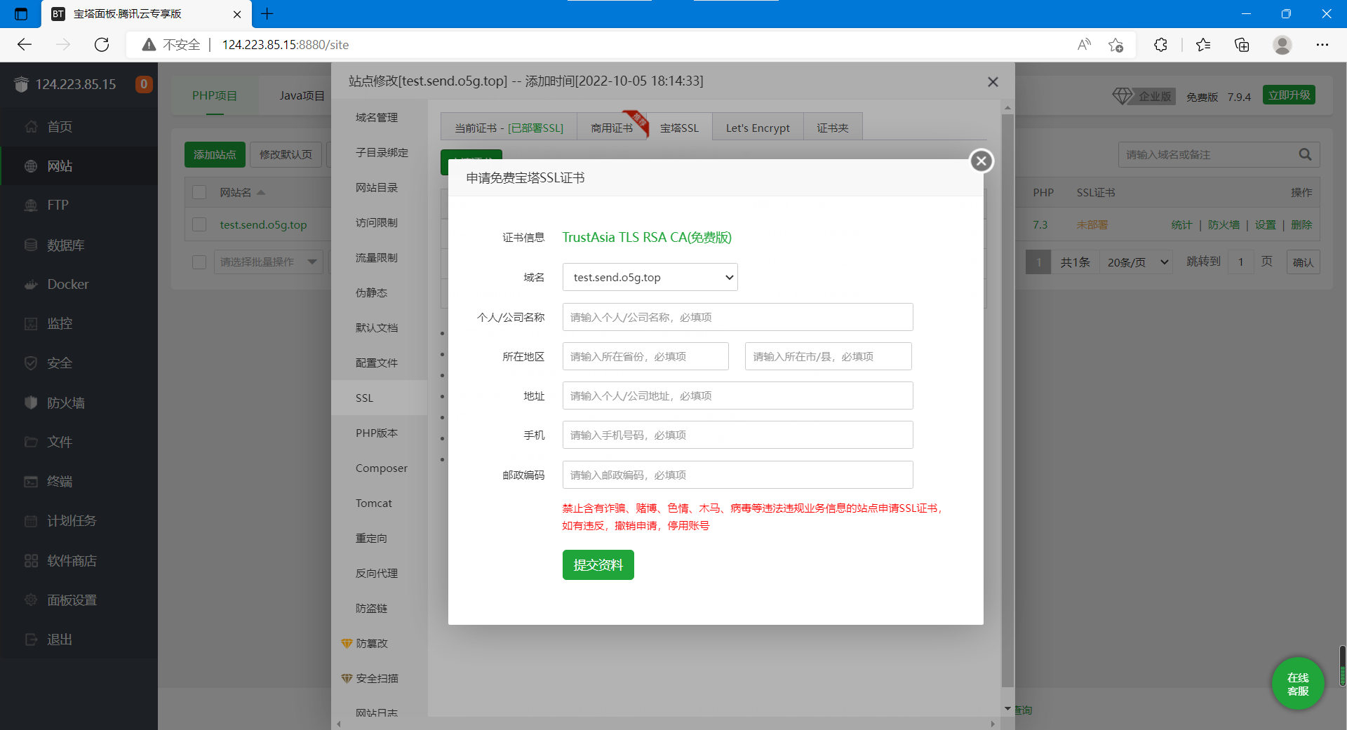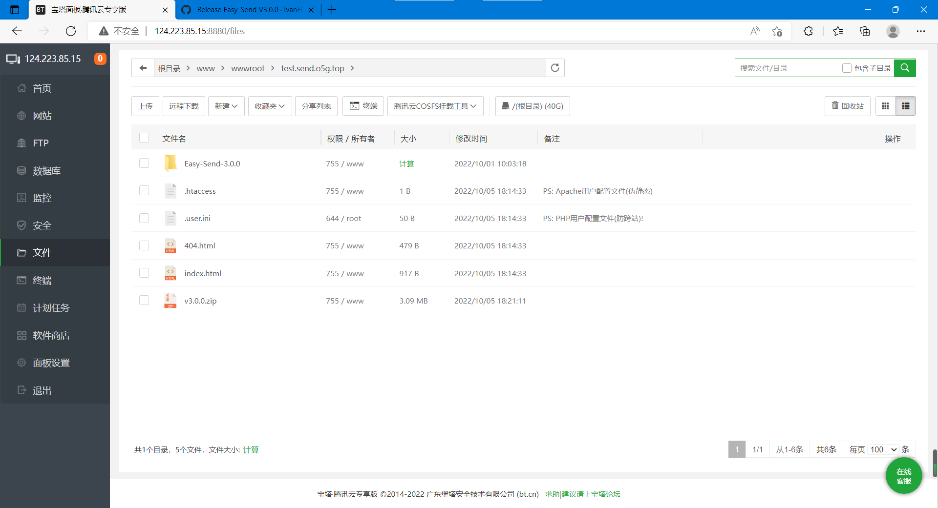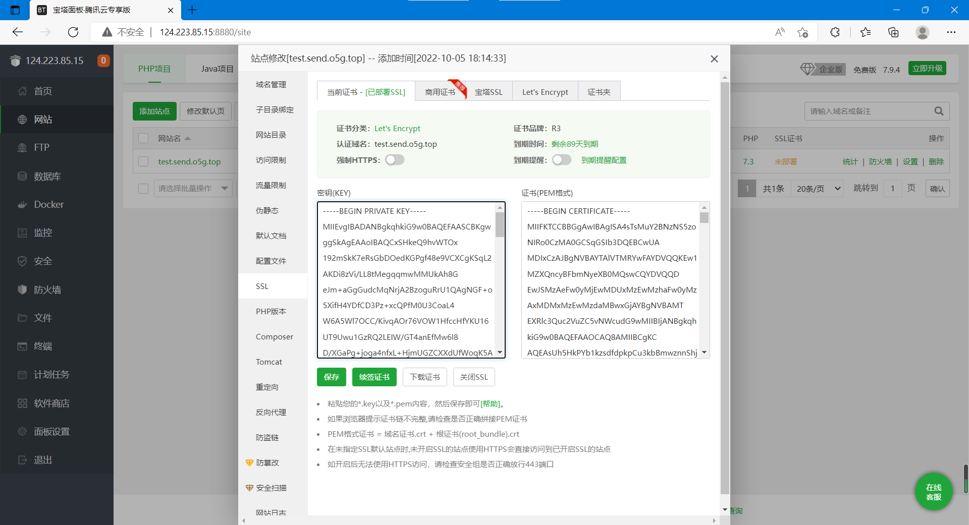 https协议是重要的网络安全协议,配置https可以防止部分数据的泄漏。在Easy-Send中,如果您需要使用公用版手机APP,则您必须配置https协议。此处通过宝塔面板进行演示