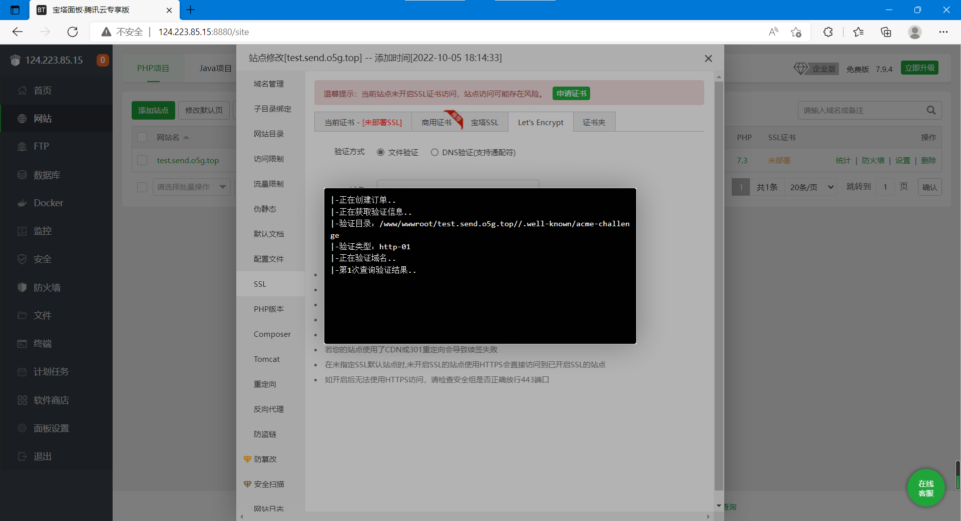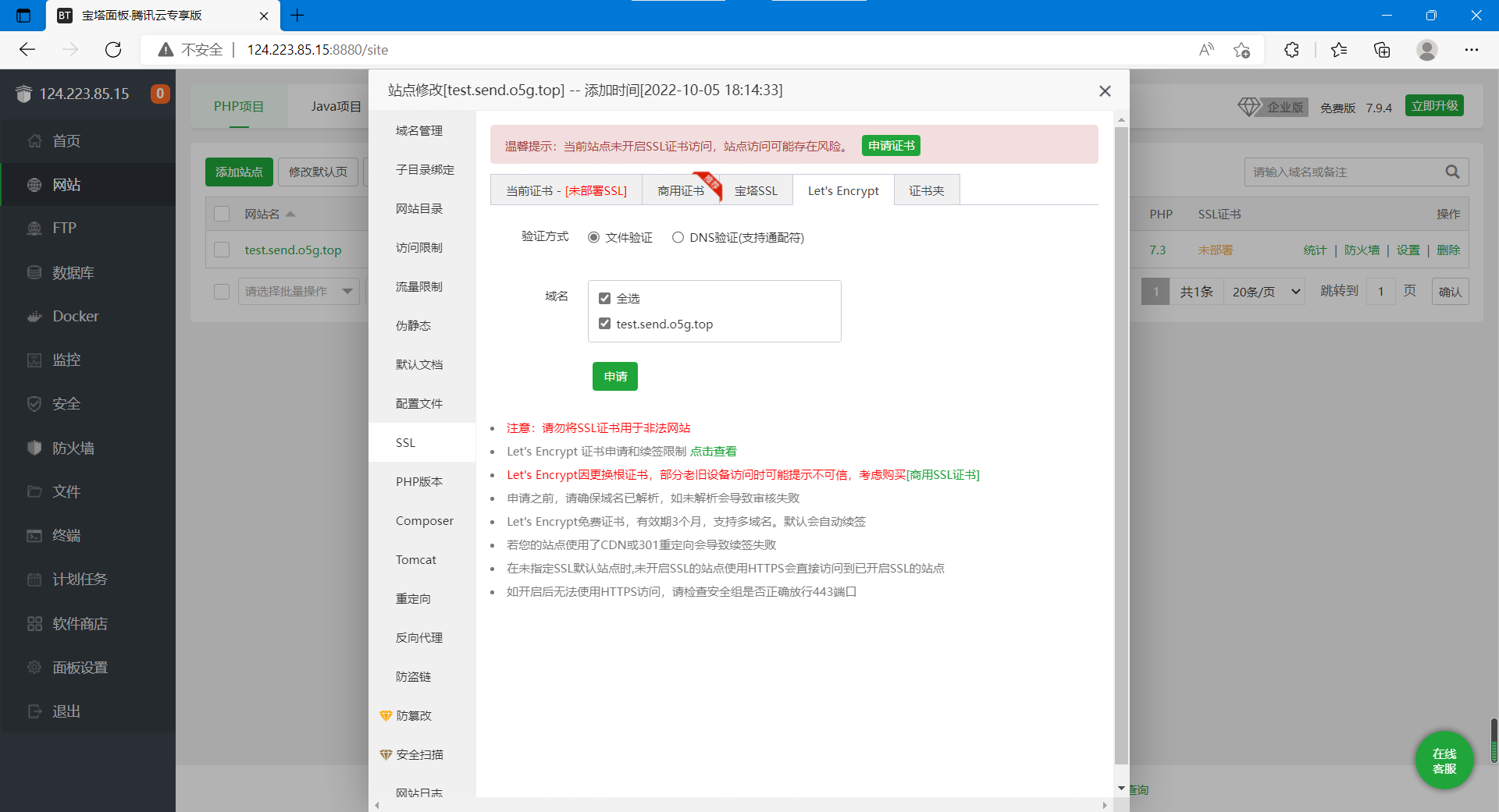 宝塔面板进入“网站”页面,选择需要部署SSL(需要https访问)的网站,选择“SSL”,点击“Let’s Encrypt”,选中需要申请证书的网址(推荐全选)以及域名的验证方式(推荐文件验证)