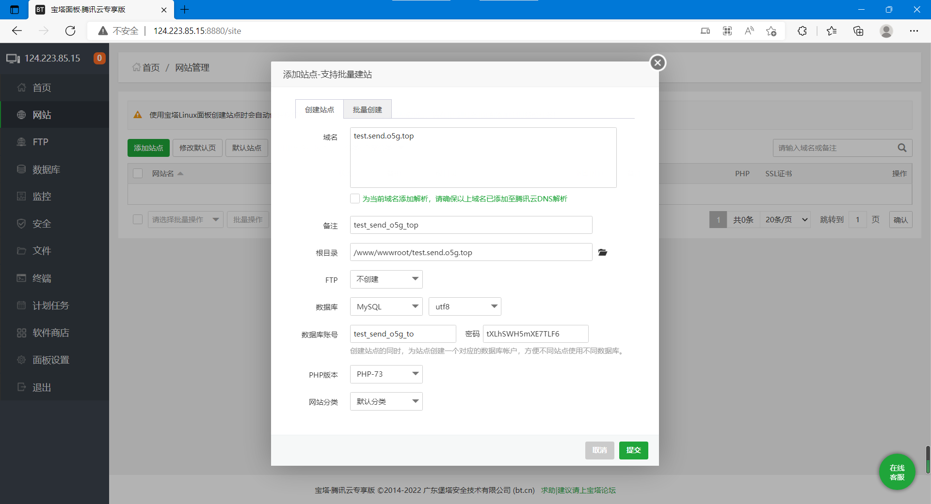 进入“网站”页面,选择“添加网站”,并配置自己的域名、添加数据库,然后点击“提交”。