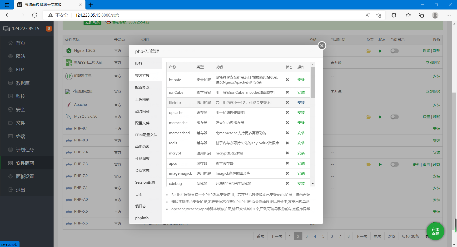 在“软件商店”中选择PHP7.3并点击“设置”,在弹出窗口中选择“安装拓展”,安装“fileinfo”拓展