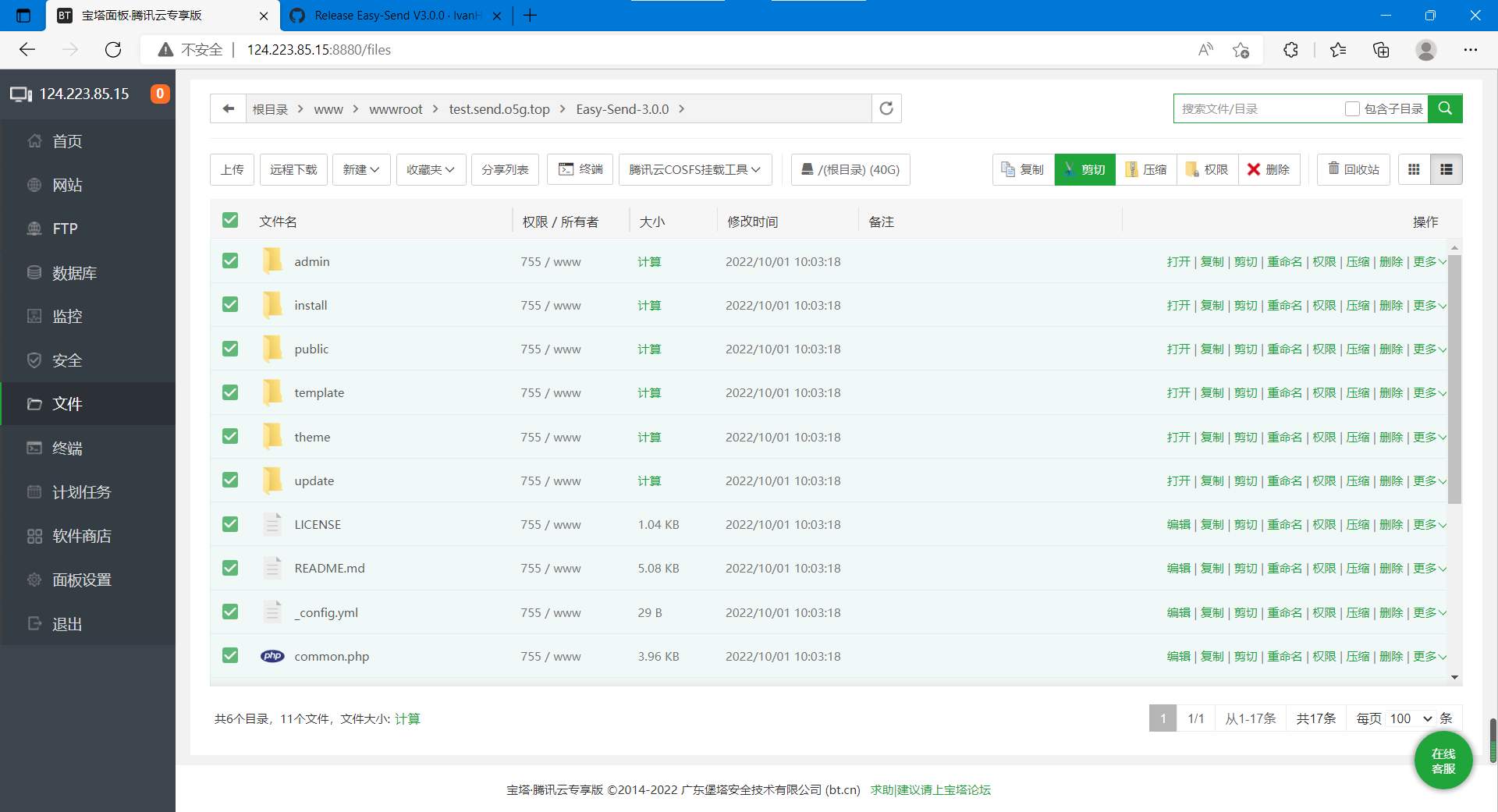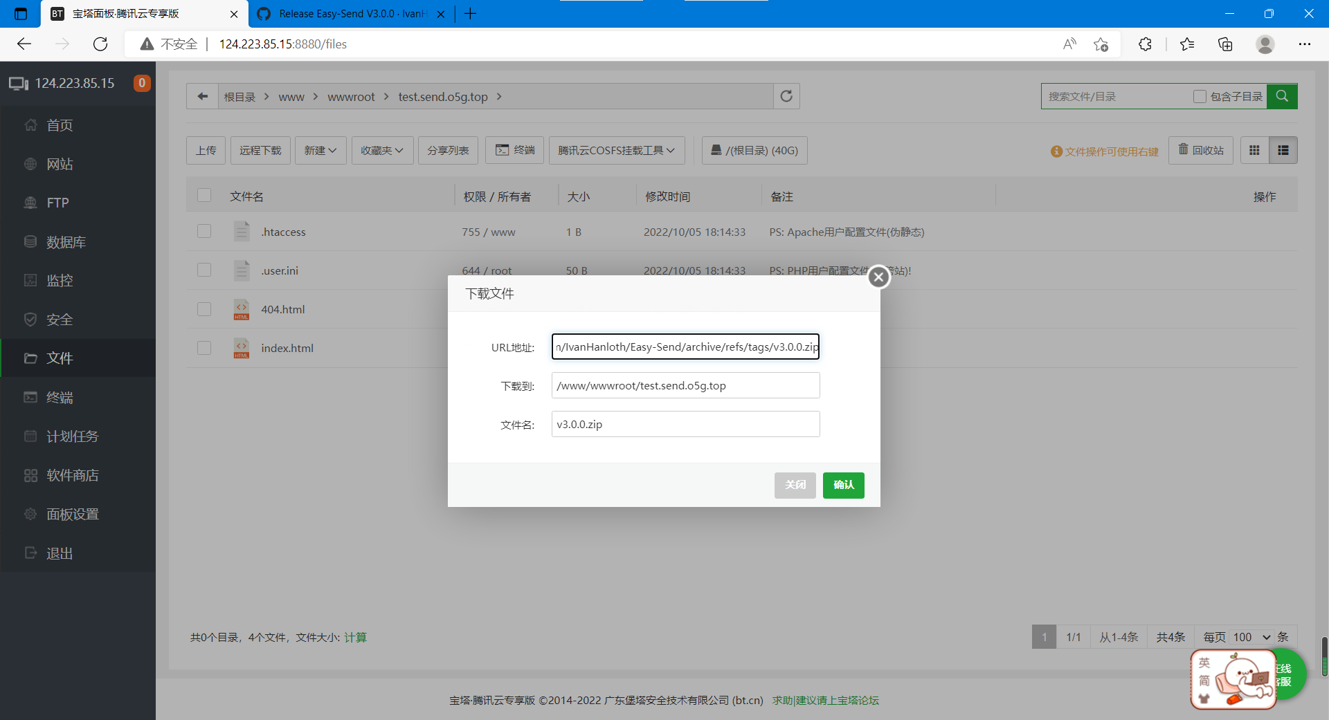 进入网站根目录(可通过点击“网站”页面中对应网站的“根目录”直接进入),选择“远程下载”下载,输入Easy-Send最新release包网址(请查看https://github.com/IvanHanloth/Easy-Send/releases/),进行下载