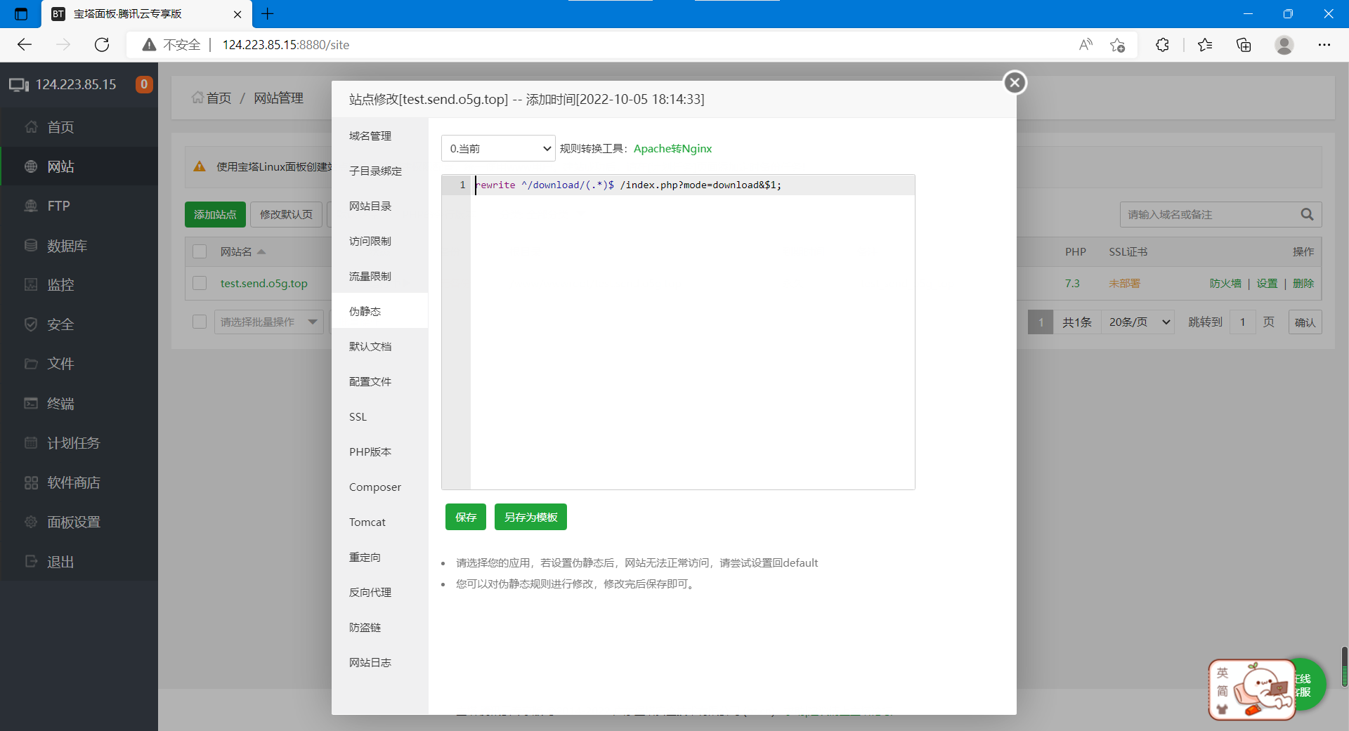 RewriteRule ^app/?$ /index.php?mode=app [QSA,L]访问“网站”页面,点击Easy-Send程序所在的网站,选择伪静态,填写以上伪静态规则