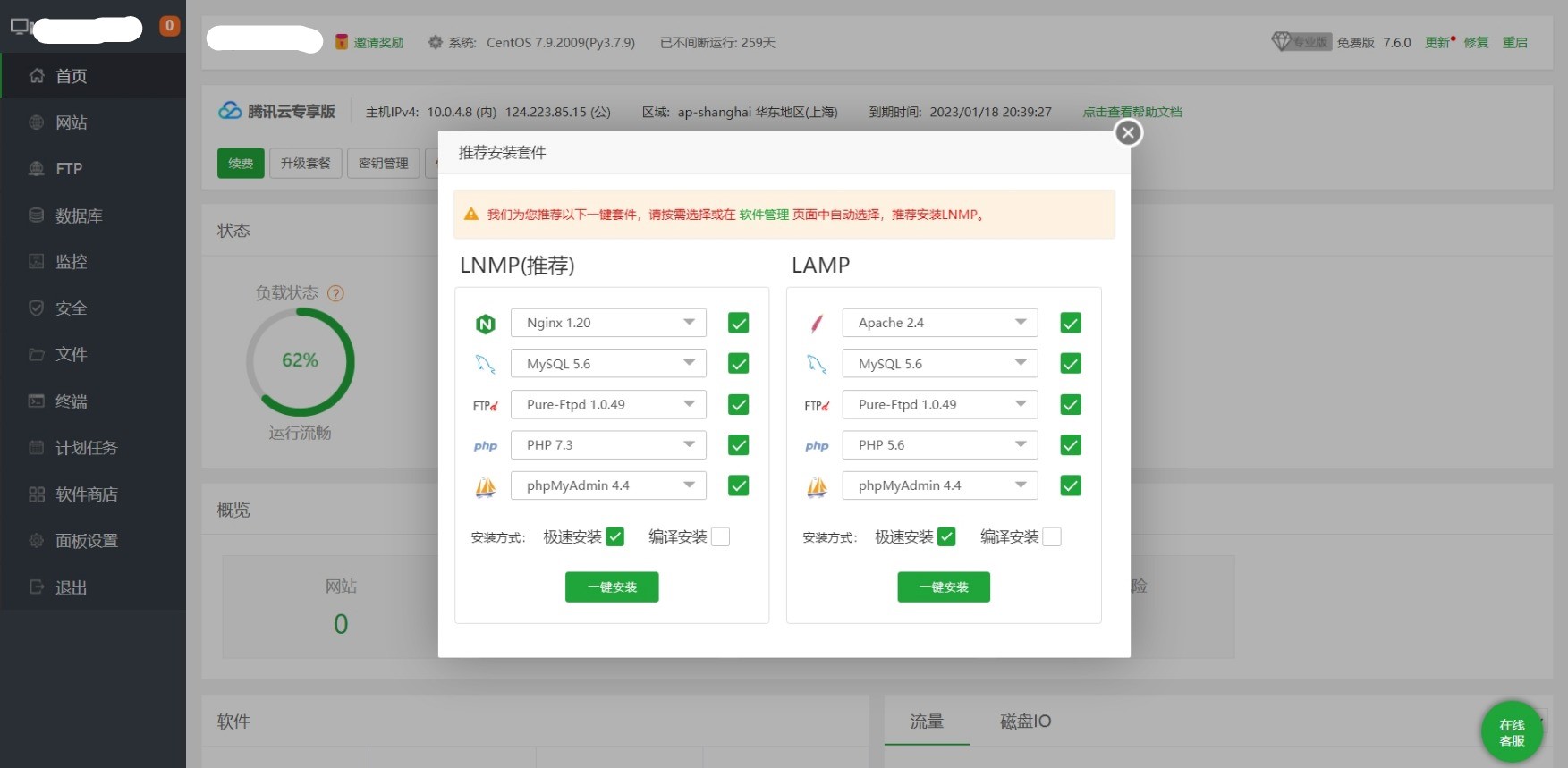 宝塔面板安装完成并成功登录后,选择LNMP环境并将PHP版本调整至7.3,然后点击一键安装即可