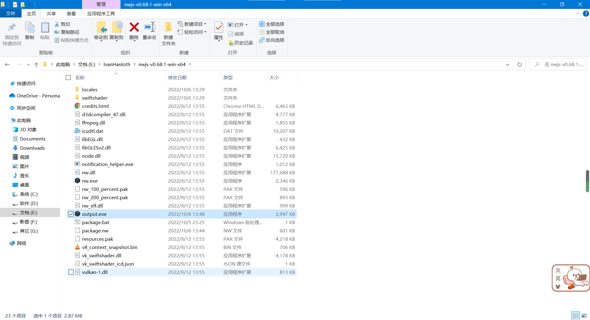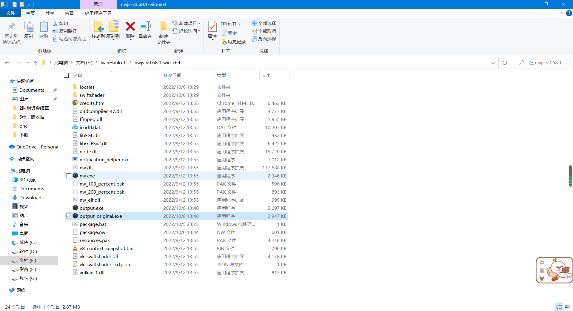 点击顶部保存按钮(或按Ctrl+S保存),可以看到nw.js的目录下出现了一个output_original.exe,这是没有改变图标的文件,可以删除。至此,图标修改完成