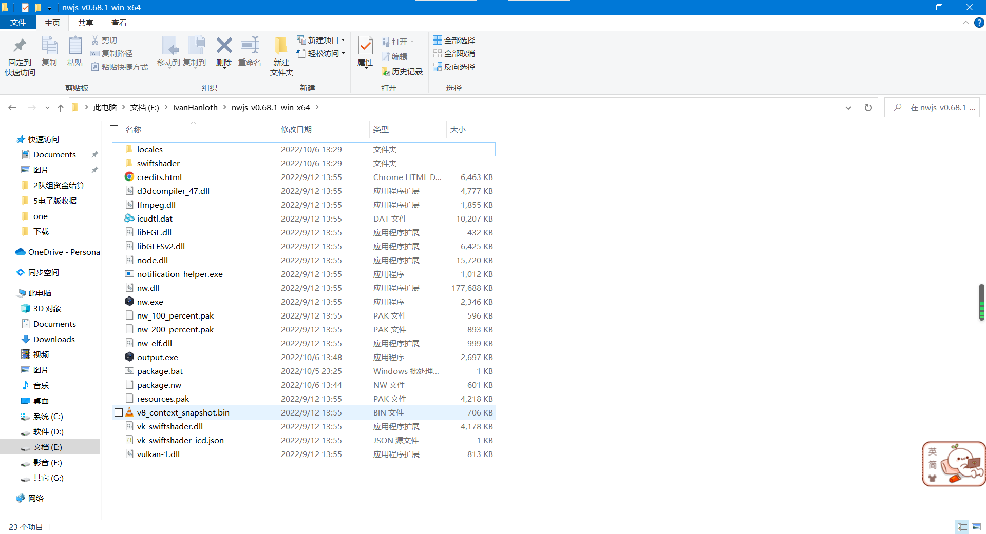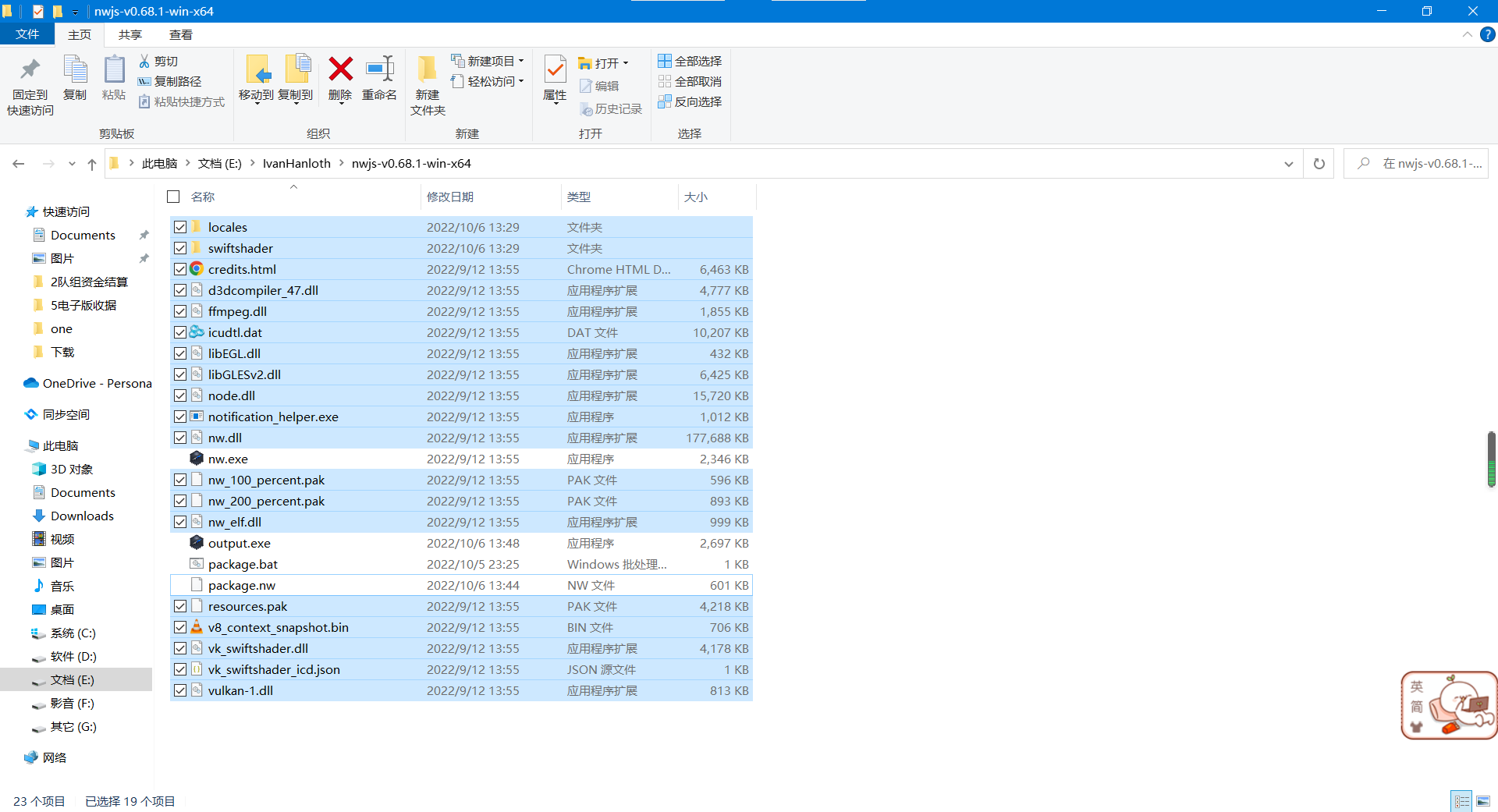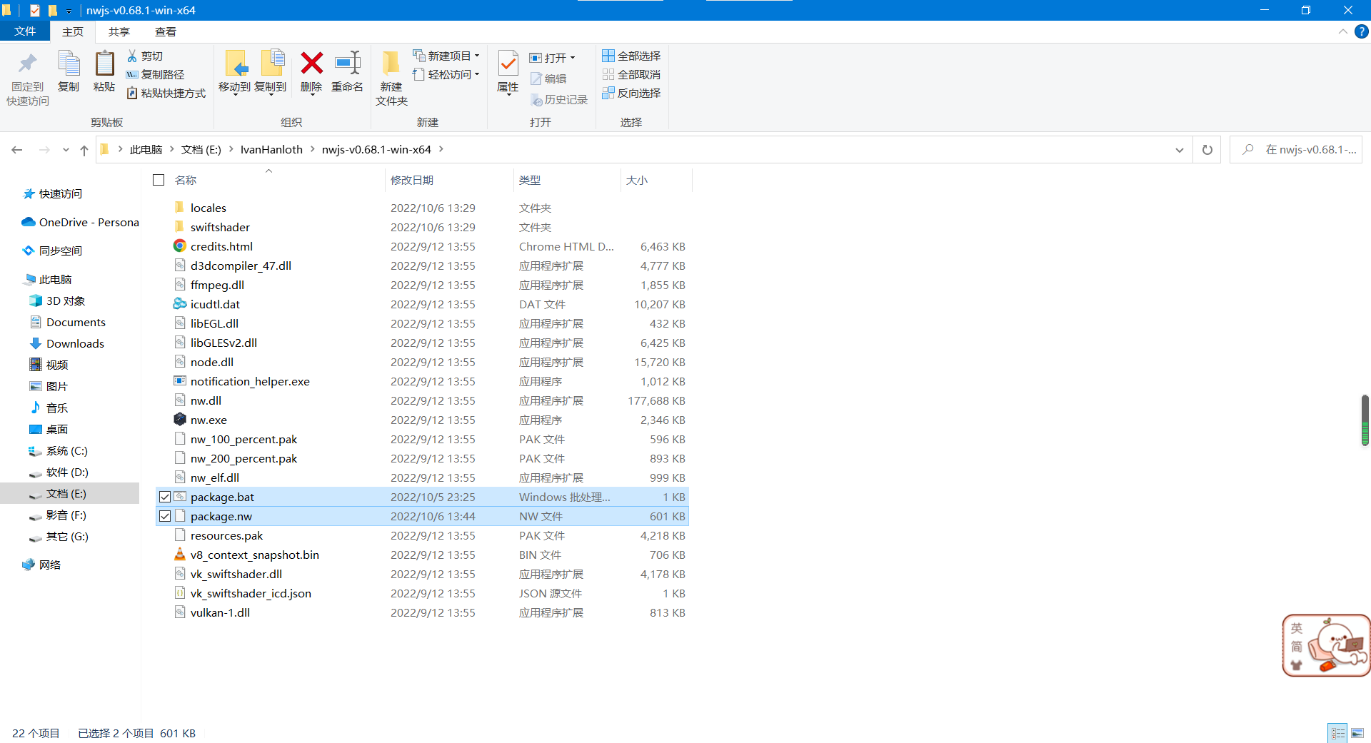 将源码文件目录下刚打包完成的package.nw和package.bat文件拷贝至nw.js解压所在目录下。